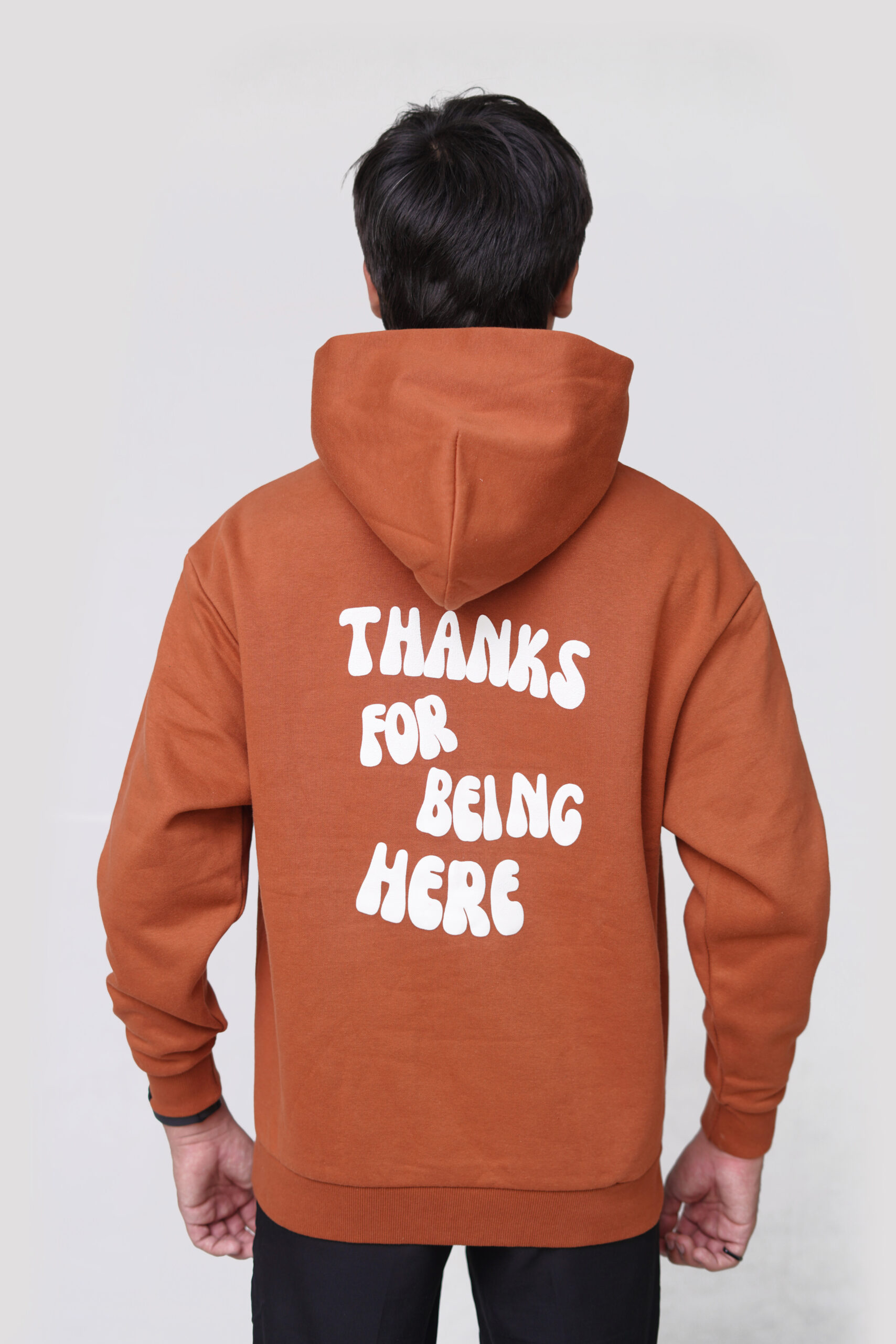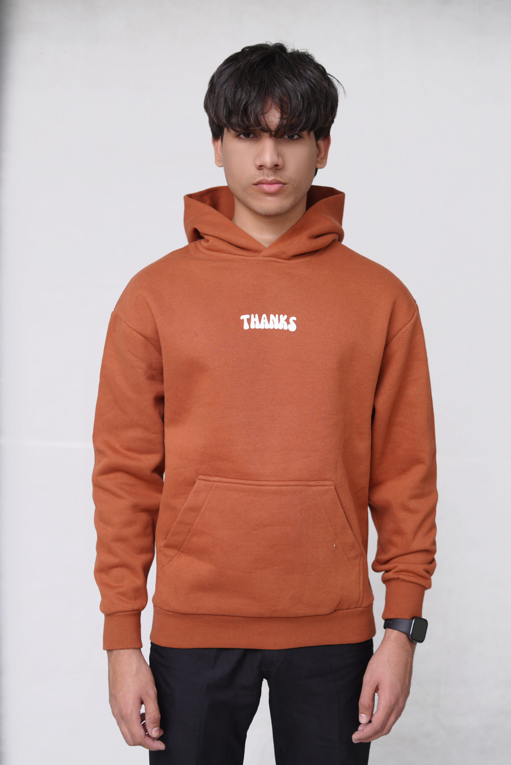 Stay cozy and stylish with this rust-orange hoodie featuring a clean “THANKS” graphic on the chest. Made from soft, durable fabric, it includes a roomy front pocket, ribbed cuffs, and an adjustable hood—perfect for everyday wear, casual outings, or layering in cooler weather.