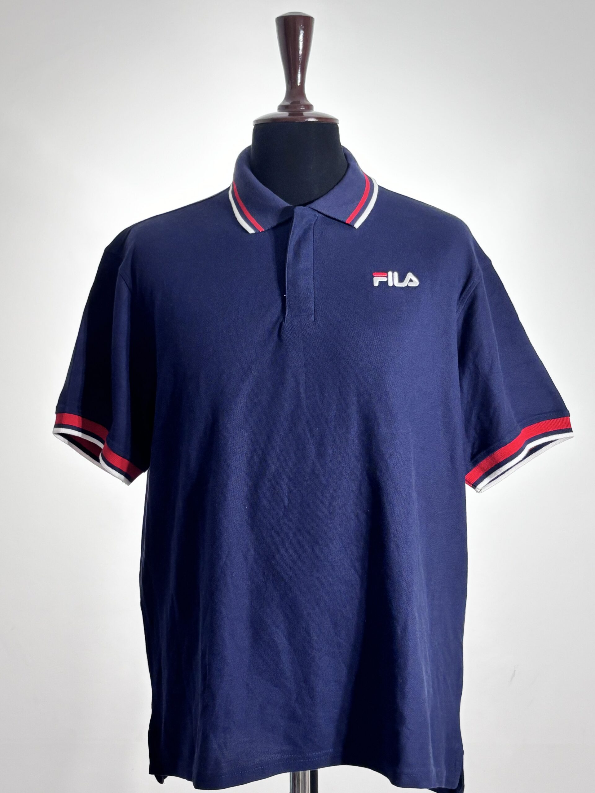 The Fila Navy Polo Shirt features a classic design with vibrant striped collar and cuffs. The embroidered Fila logo adds a sporty touch to this comfortable and versatile polo, perfect for casual wear.s for a stylish sporty vibe.